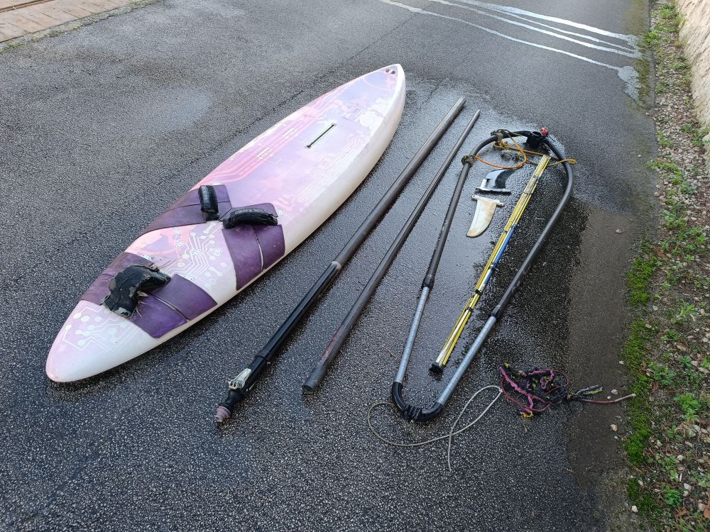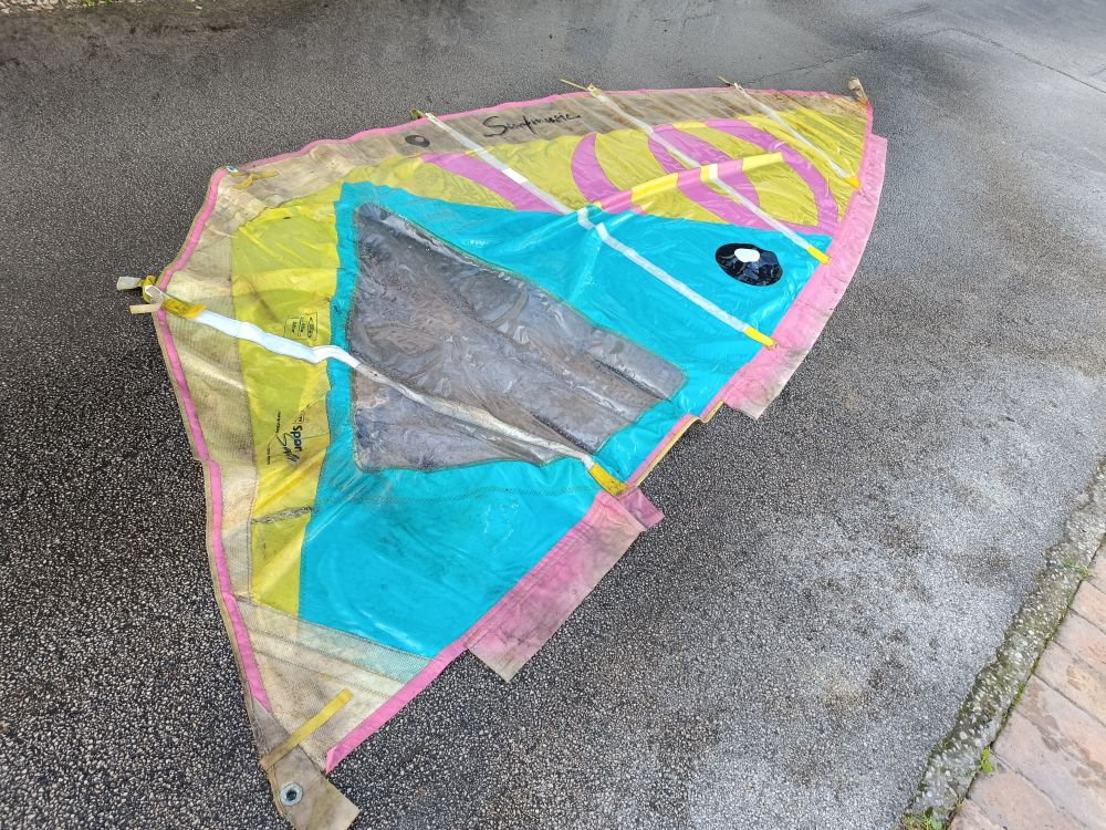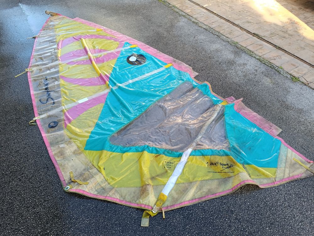 Windsurf anni 90 con due vele. una integra ed un altra da riparare