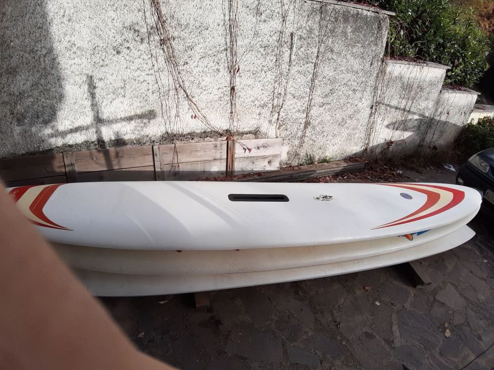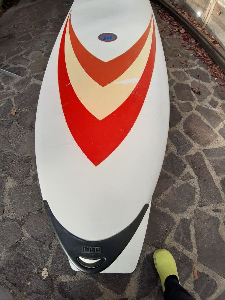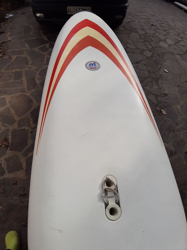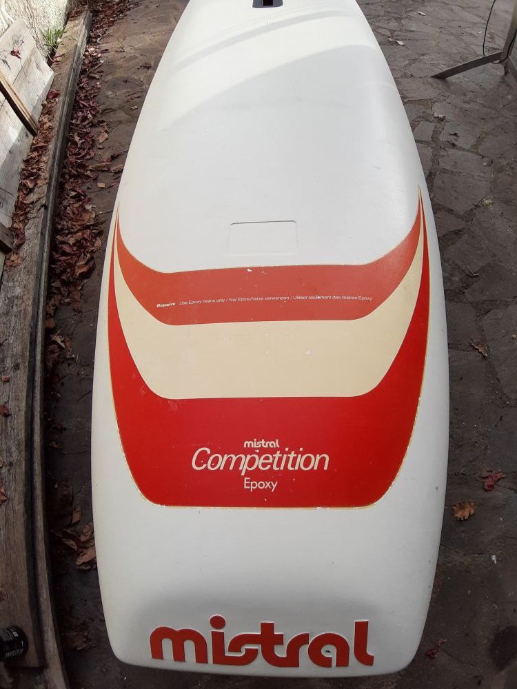 Vendo windsurf Mistral Competition Epoxy, completo di piede d'albero originale, deriva basculante e pinna basculante.